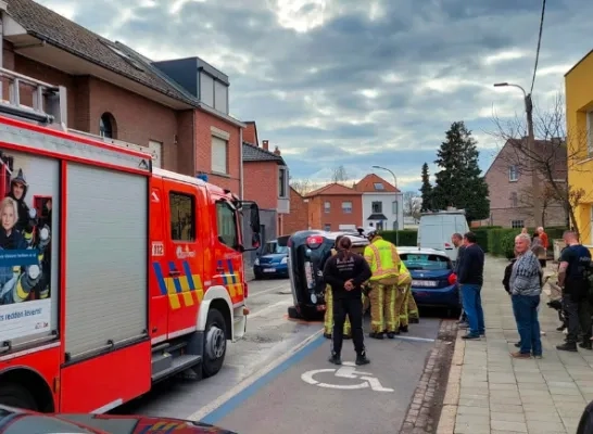 In de Galgestraat in Mechelen is een auto zaterdagmiddag op zijn zij beland. De bestuurder, een man van 77, en zijn hond die ook in de auto zat, raakten gelukkig niet gewond.