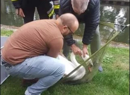Gisteravond werden de brandweer en vrijwilligers van Wildlife Taxi Team Midden-kempen opgeroepen richting de nieuwe kaai in Turnhout. Enkele dierenvrienden merkten op dat een van de oudere zwanen fel verzwakt was en al een tijd midden in het kanaal hulpeloos ronddobberde.