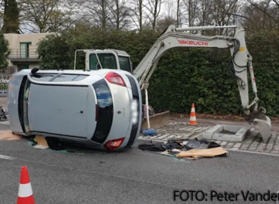 Wagen op zijkant door aanrijding met graafmachine