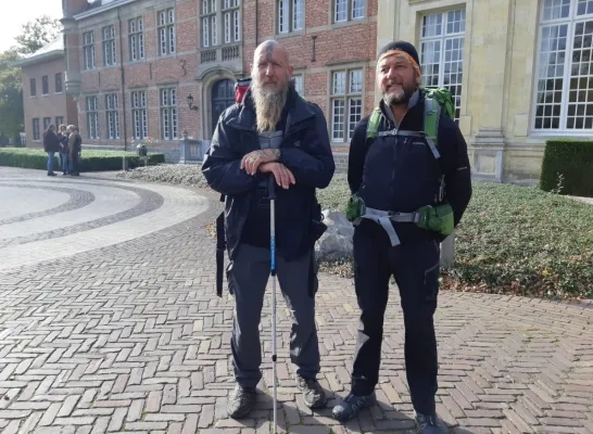 Balenaar Sus Van Gompel en Manu Vandenbergh uit Mol zijn weer thuis na hun wandeltocht naar het bedevaartsoord Santiago de Compostella in het noordwesten van Spanje. Op 28 juli vertrokken ze vanuit Mol. Gisteravond landden ze op Zaventem en vanmorgen wandelden ze naar de abdij van Mol-Postel om daar hun laatste stempel te krijgen. Hun verhaal krijgt u morgen in RTV Vandaag.